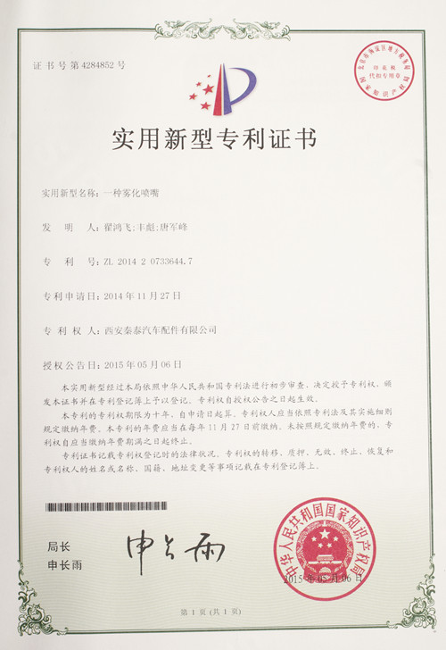 2015年5月秦泰公司申請的”一種霧化噴嘴“ 專利產(chǎn)品,證書正式頒發(fā)。