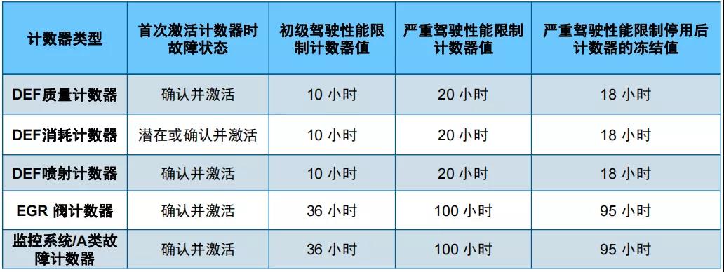 其中尿素液位故障不由時(shí)間決定,而是由尿素剩余量決定。 當(dāng)駕駛員報(bào)警系統(tǒng)達(dá)到Level3時(shí),此時(shí)車輛已經(jīng)處于半廢狀態(tài),有時(shí)司機(jī)可能急需用車,沒有太多時(shí)間來(lái)維修,這就需要臨時(shí)解除限速。當(dāng)滿足下列條件之一時(shí),駕駛員報(bào)警和駕駛性能限制系統(tǒng)將自動(dòng)停用:(2)包含與故障相關(guān)的信息已被工具擦除也就是說(shuō),當(dāng)車輛限速20km/h時(shí),通過(guò)解碼器臨時(shí)消除故障碼,可以將車輛限速暫時(shí)解除,但也只是暫時(shí)而已。如果故障沒從根本上解決,這種方法只能起作用幾個(gè)小時(shí),過(guò)了這段時(shí)間,還是會(huì)限速的。所以這種方法只在特定的場(chǎng)景下可以采用。為什么只能恢復(fù)幾個(gè)小時(shí)呢?我們來(lái)看第3點(diǎn)。 駕駛員報(bào)警系統(tǒng)依據(jù)計(jì)數(shù)器的計(jì)數(shù)值工作,當(dāng)故障發(fā)生并確認(rèn)的時(shí)候,計(jì)數(shù)器開始計(jì)數(shù)。當(dāng)計(jì)數(shù)到10小時(shí)/36小時(shí),啟用初級(jí)駕駛性能限制,當(dāng)計(jì)數(shù)到20小時(shí)/100小時(shí),啟用嚴(yán)重駕駛性能限制。 而臨時(shí)解除限速的原理是:以尿素噴射故障為例,當(dāng)車輛處于嚴(yán)重駕駛性能限制階段時(shí),此時(shí)計(jì)數(shù)器已經(jīng)達(dá)到或超過(guò)20小時(shí),此時(shí)如果通過(guò)解碼器消除故障碼,計(jì)數(shù)器的值將會(huì)凍結(jié)在18小時(shí),這意味著有2個(gè)小時(shí)的時(shí)間車輛是處于降扭25%的情況(18小時(shí)超過(guò)10小時(shí),所以處于Level2)。但是如果超過(guò)2個(gè)小時(shí)依然沒有解決故障,還是會(huì)限速的。