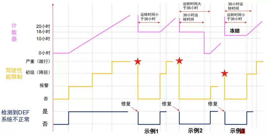 下圖為故障碼狀態(tài)、駕駛員報(bào)警系統(tǒng)狀態(tài)和計(jì)數(shù)器之間的關(guān)系,可以幫助理解。